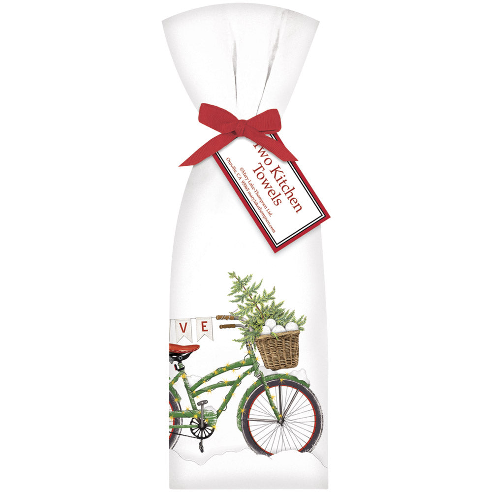 Two hand folded flour sack towels tied with a matching bow and hang tag