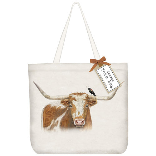 Canvas tote printed with a decorative graphic and finished with a matching bow and hang tag.