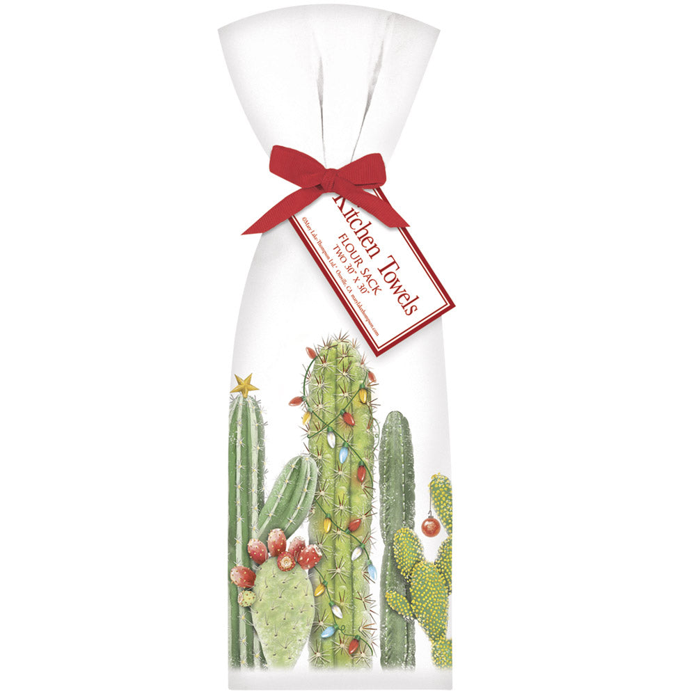Two hand folded flour sack towels tied with a matching bow and hang tag