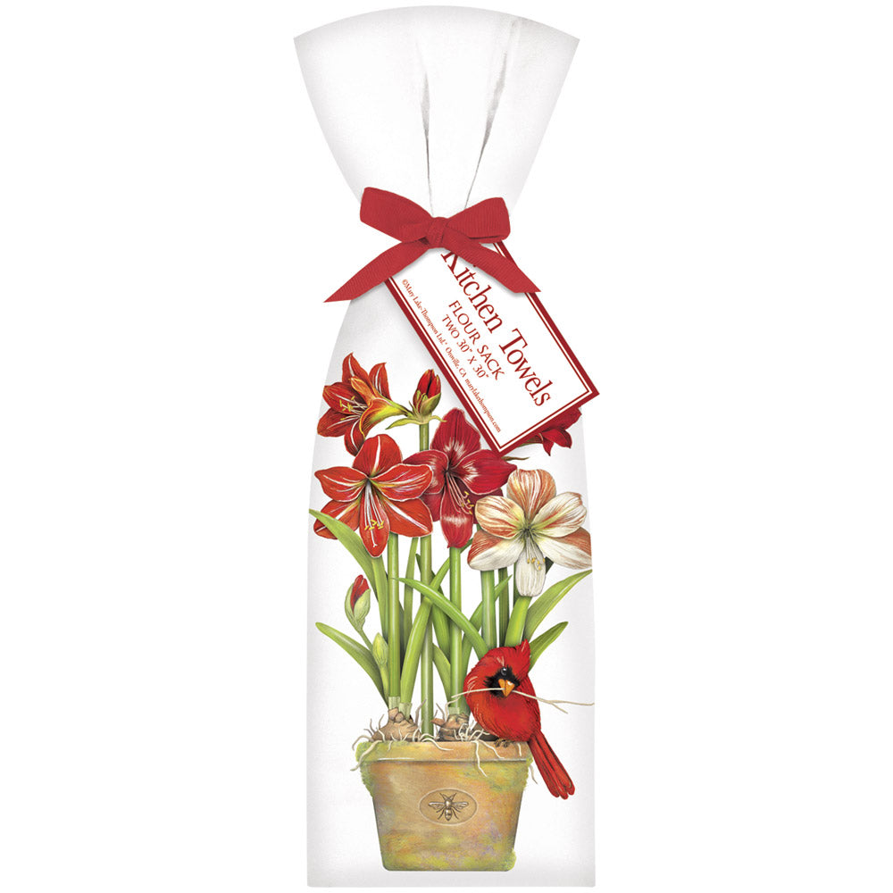 Two hand folded flour sack towels tied with a matching bow and hang tag