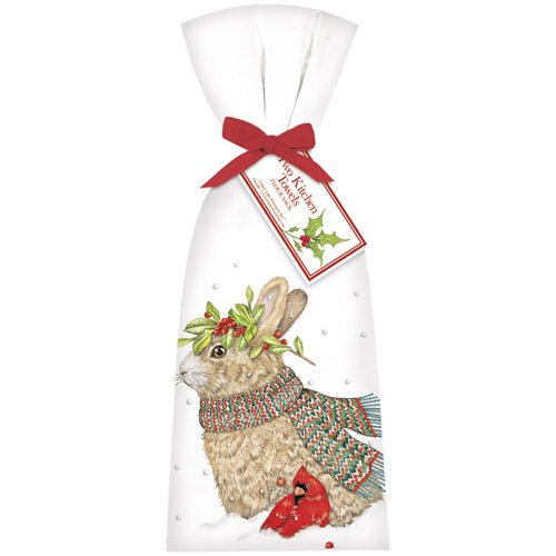 Two hand folded flour sack towels tied with a matching bow and hang tag