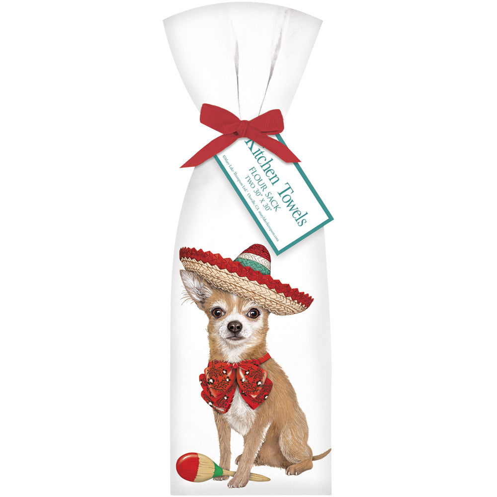 Two hand folded flour sack towels tied with a matching bow and hang tag