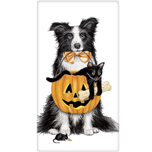 A single hand folded flour sack towel with a decorative graphic
