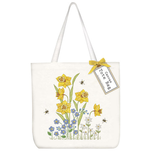 Canvas tote printed with a decorative graphic and finished with a matching bow and hang tag.