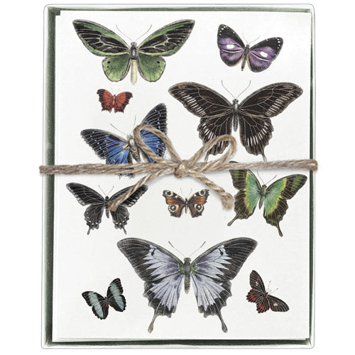 Set of eight blank cards with envelopes in a gift box tied with jute twine.