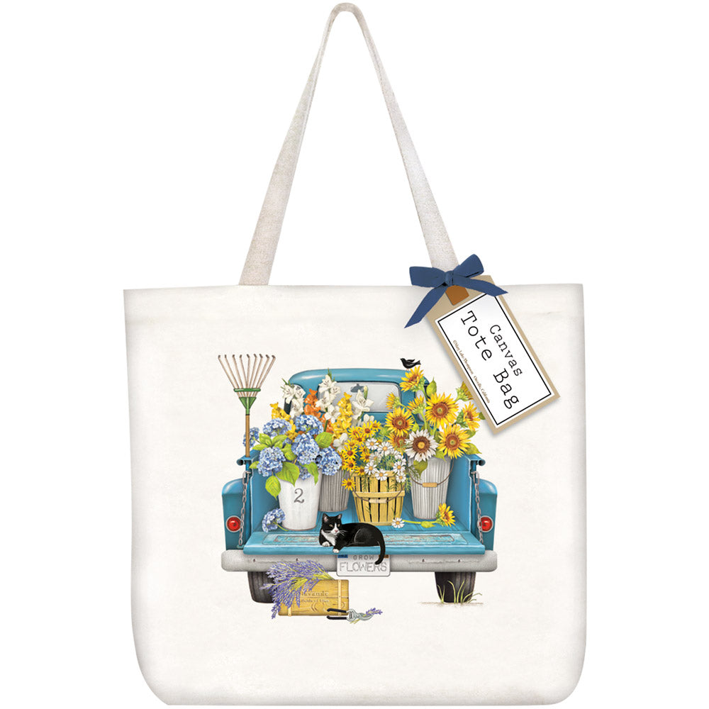 Canvas tote printed with a decorative graphic and finished with a matching bow and hang tag.