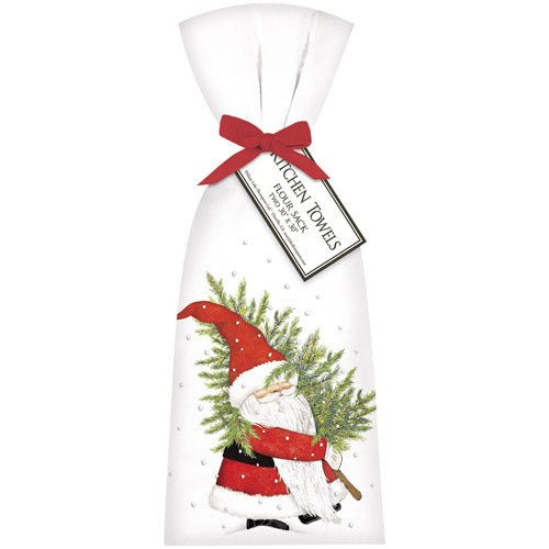 Two hand folded flour sack towels tied with a matching bow and hang tag