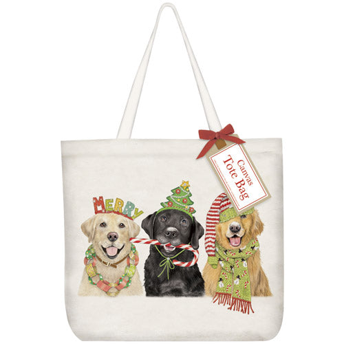 Canvas tote printed with a decorative graphic and finished with a matching bow and hang tag.