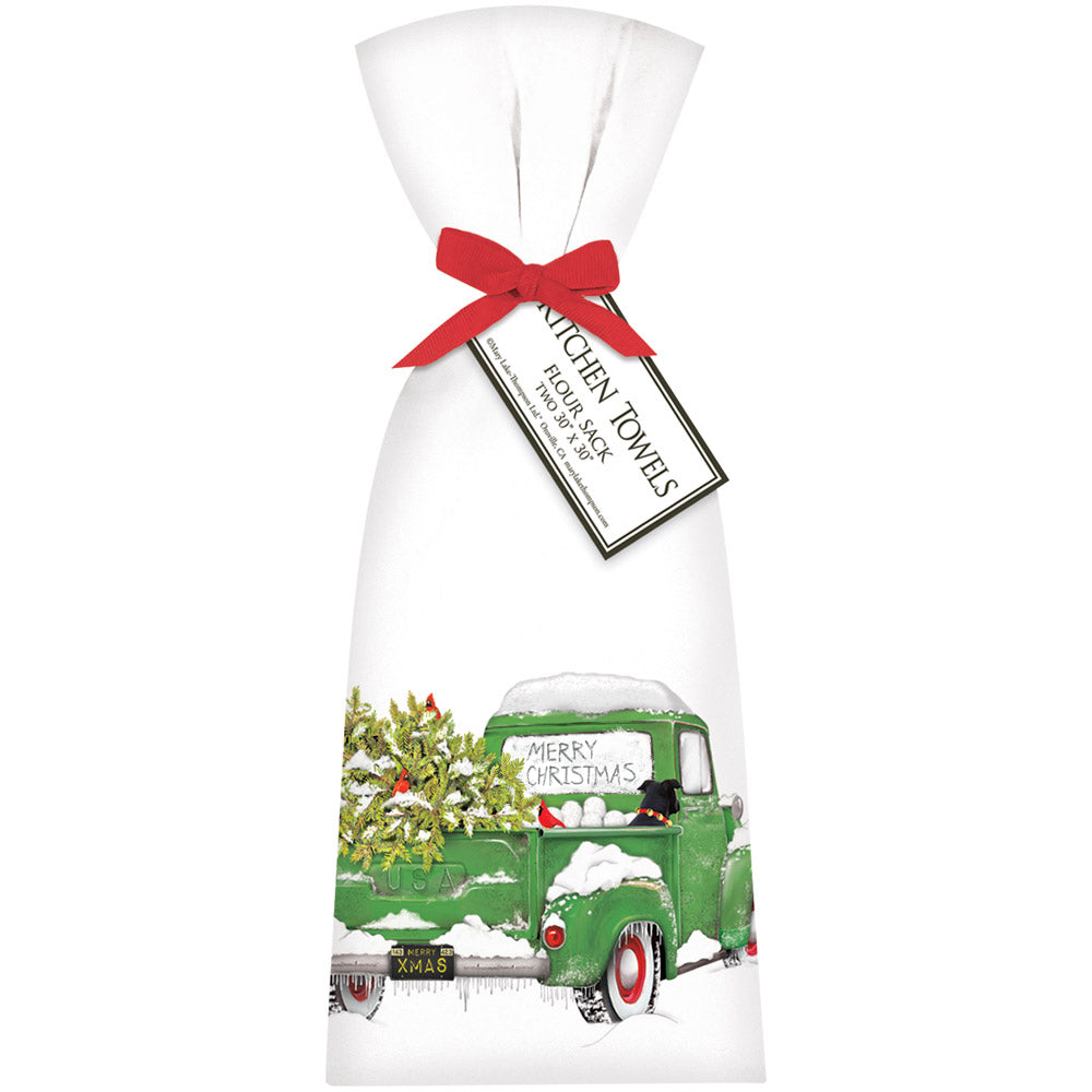 Two hand folded flour sack towels tied with a matching bow and hang tag