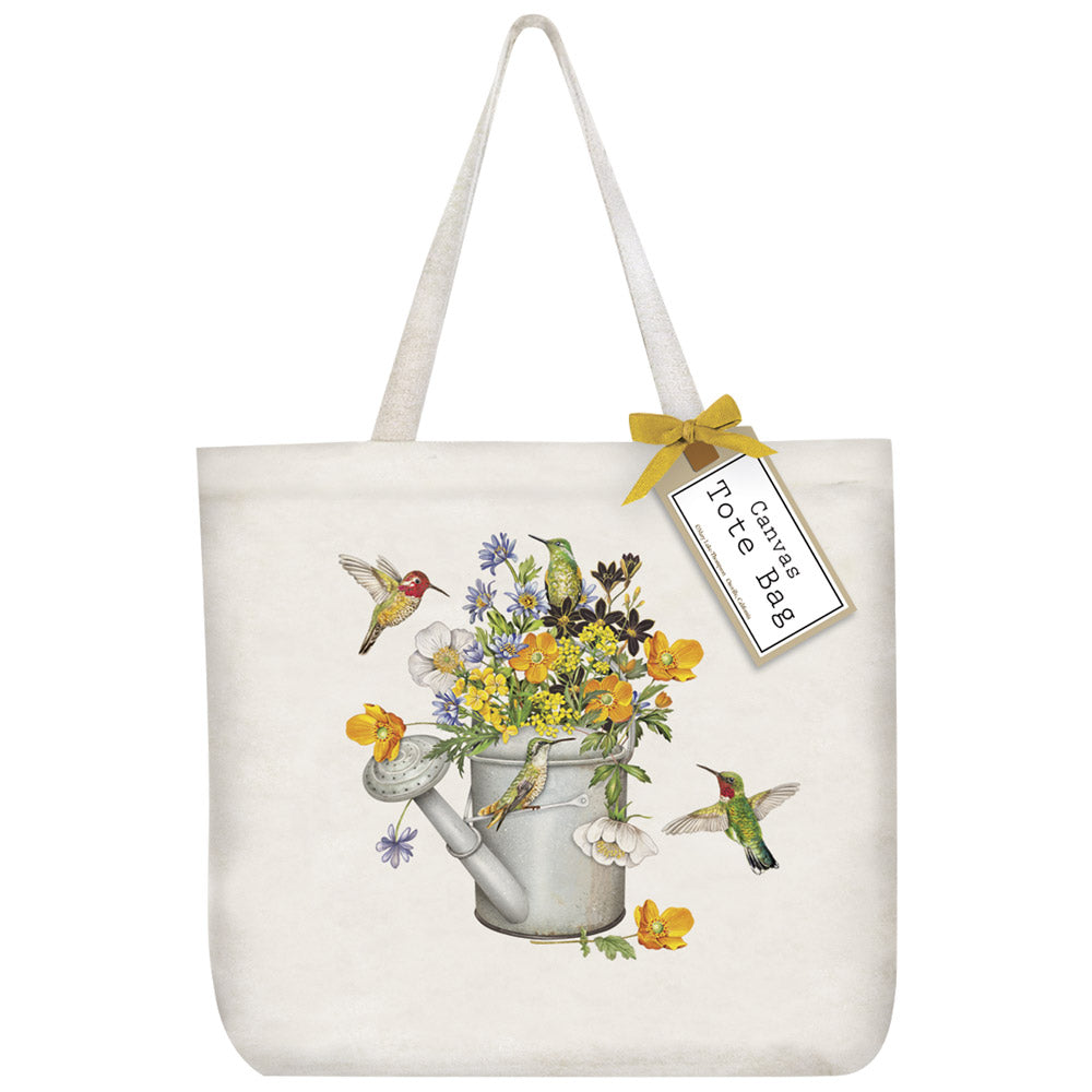 Canvas tote printed with a decorative graphic and finished with a matching bow and hang tag.