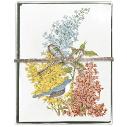 Set of eight blank cards with envelopes in a gift box tied with jute twine.