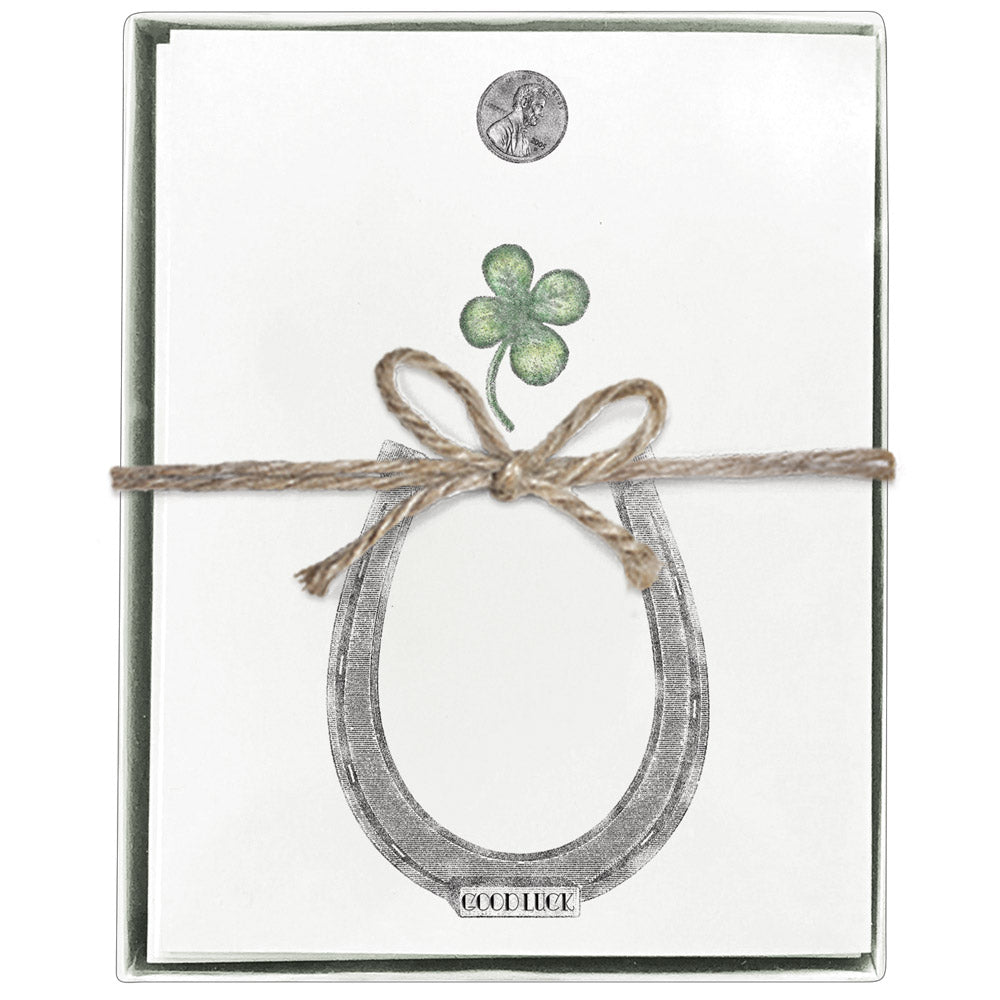 Set of eight blank cards with envelopes in a gift box tied with jute twine.