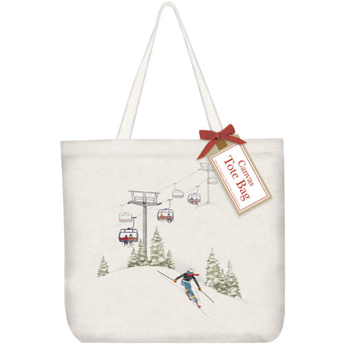 Canvas tote printed with a decorative graphic and finished with a matching bow and hang tag.