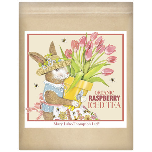- Four quart size raspberry iced tea bags in a paper wrapper.