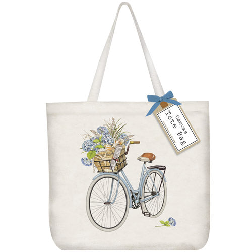 Canvas tote printed with a decorative graphic and finished with a matching bow and hang tag.