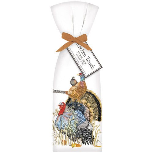 Two hand folded flour sack towels tied with a matching bow and hang tag