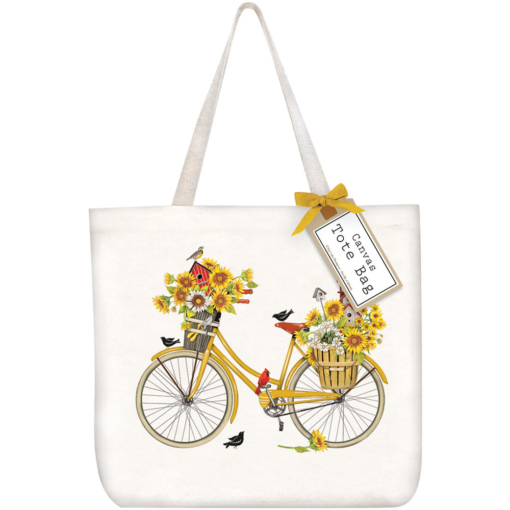 Canvas tote printed with a decorative graphic and finished with a matching bow and hang tag.