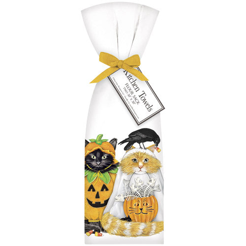 Two hand folded flour sack towels tied with a matching bow and hang tag