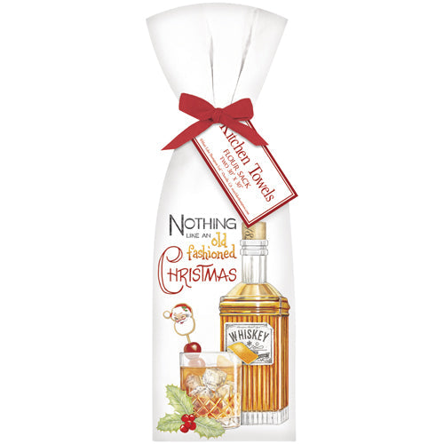 Two hand folded flour sack towels tied with a matching bow and hang tag