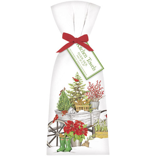 Two hand folded flour sack towels tied with a matching bow and hang tag