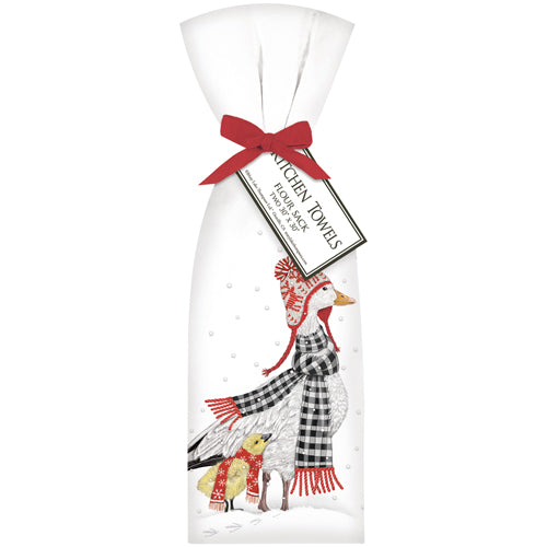 Two hand folded flour sack towels tied with a matching bow and hang tag