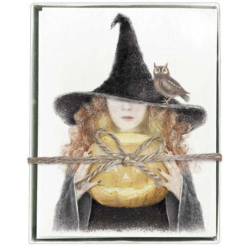 Set of eight blank cards with envelopes in a gift box tied with jute twine.