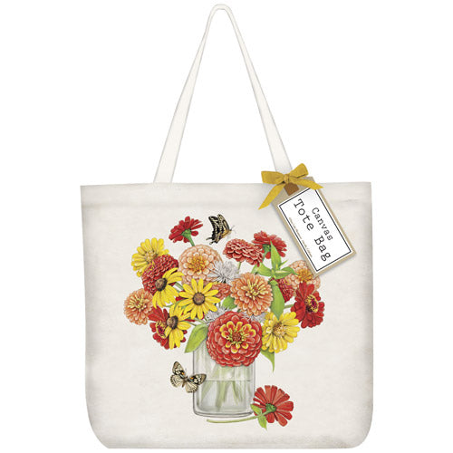 Canvas tote printed with a decorative graphic and finished with a matching bow and hang tag.
